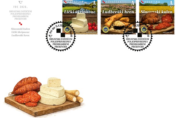Hrvatska pošta stavit će u optjecaj 15. travnja tri nove prigodne marke iz serije „Hrvatski zaštićeni poljoprivredni i prehrambeni proizvodi“ koja izlazi svake druge, parne, godine. Ovaj su put na markama motivi slavonski kulen (ili slavonski kulin), sir lički škripavac i ludbreški hren. Autor maraka nominalne vrijednosti označene slovnom oznakom A zagrebački je dizajner Dean Roksandić. Nove marke tiskane su tehnikom višebojnog ofseta u arčićima s 9 maraka i u nakladi 25.000 primjeraka po motivu, a izdanje prati i prigodna omotnica prvog dana (FDC).Nove marke s prikazima naših zaštićenih poljoprivrednih i prehrambenih proizvoda potražite od 15. travnja u poštanskim uredima ili na www.epostshop.hr .